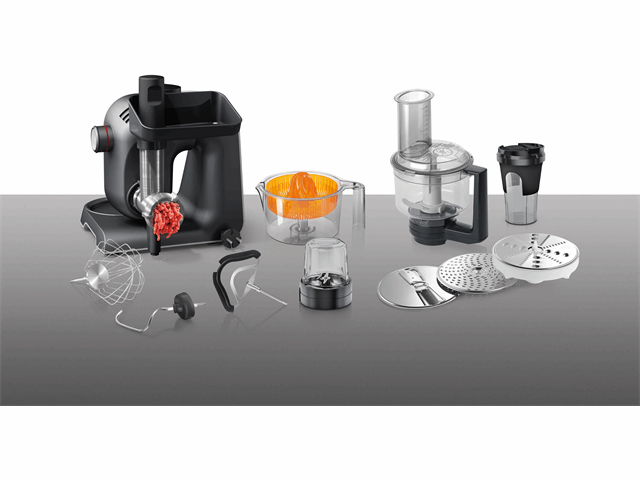 | Meegeleverd | deeghaken, fijnsnijder, kloppers, citruspers, garde, ballonklopper, snijschijf, hakschijf, blender (hulpstuk), receptenboek, kneder, deeg kom, hak kom |